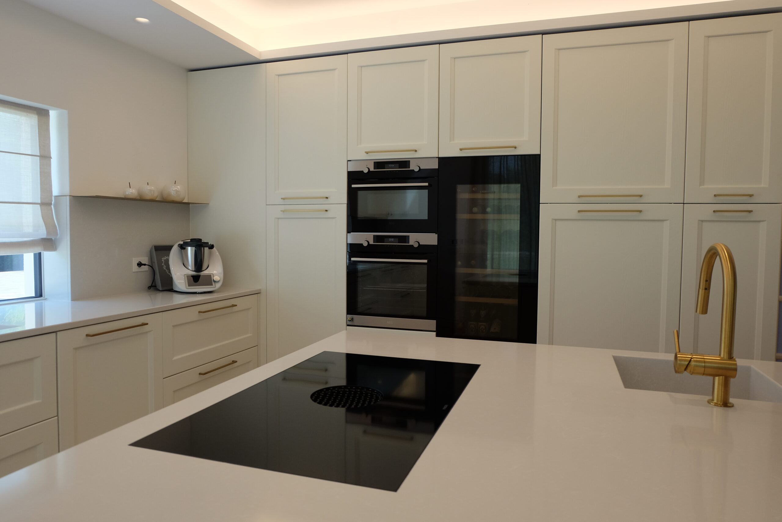 • OLTRE IL MURO: abbiamo fatto “entrare” il top in quarzite direttamente nello spessore della finestra. Questa scelta non è solo estetica: elimina i giunti, facilita la pulizia e aumenta la superficie di lavoro, regalando una profondità che una cucina standard non potrebbe avere