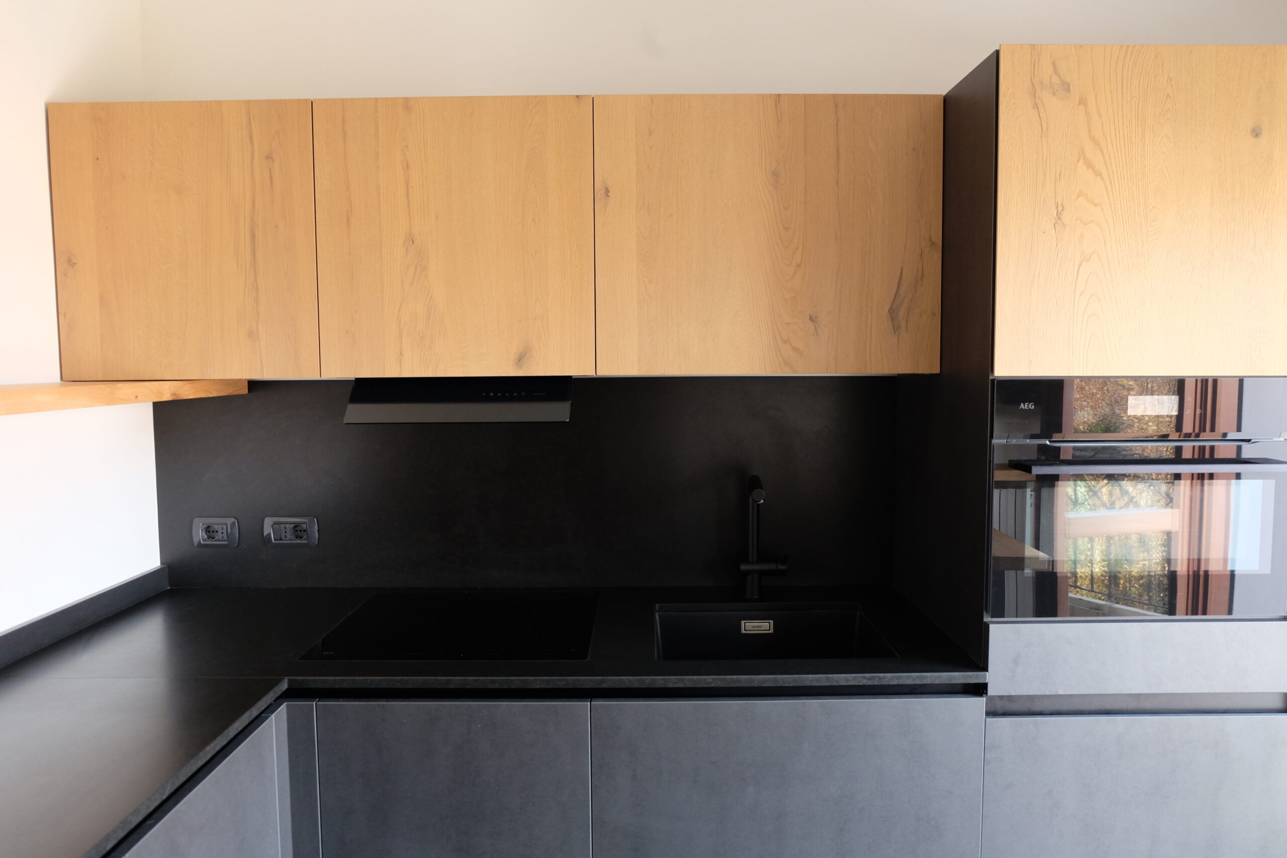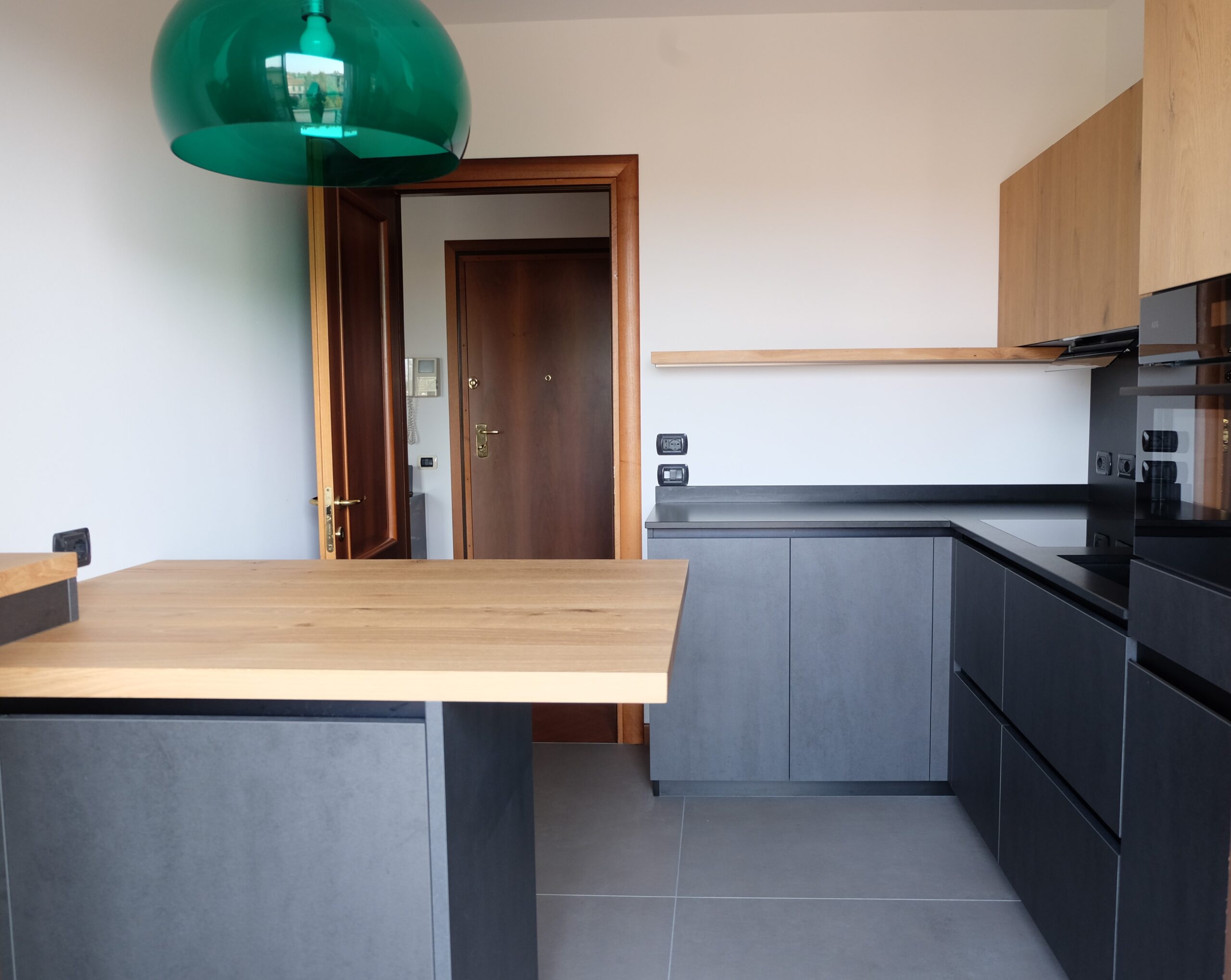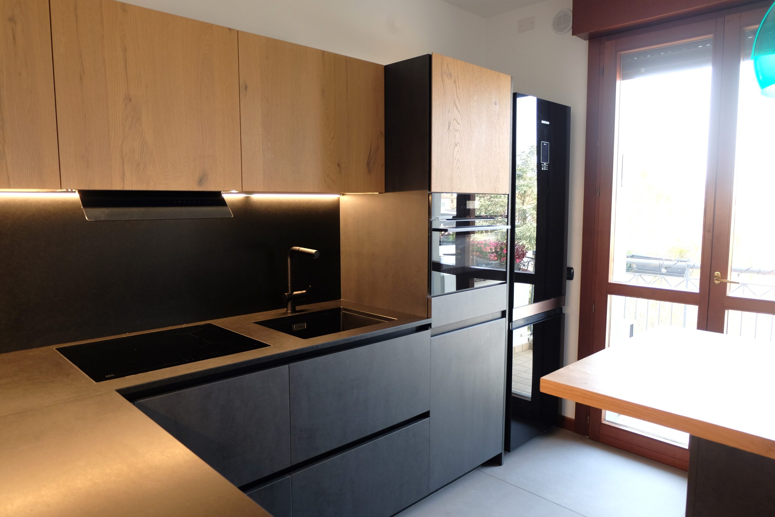 CUCINA NERA CON PIANO IN GRANITO E DETTAGLI IN LEGNO MASSELLO