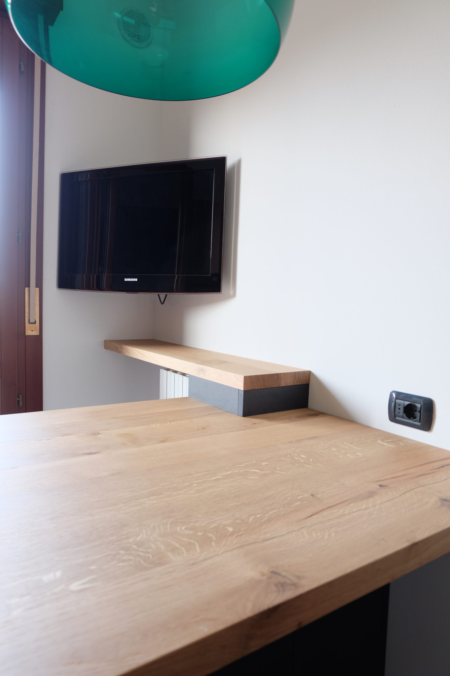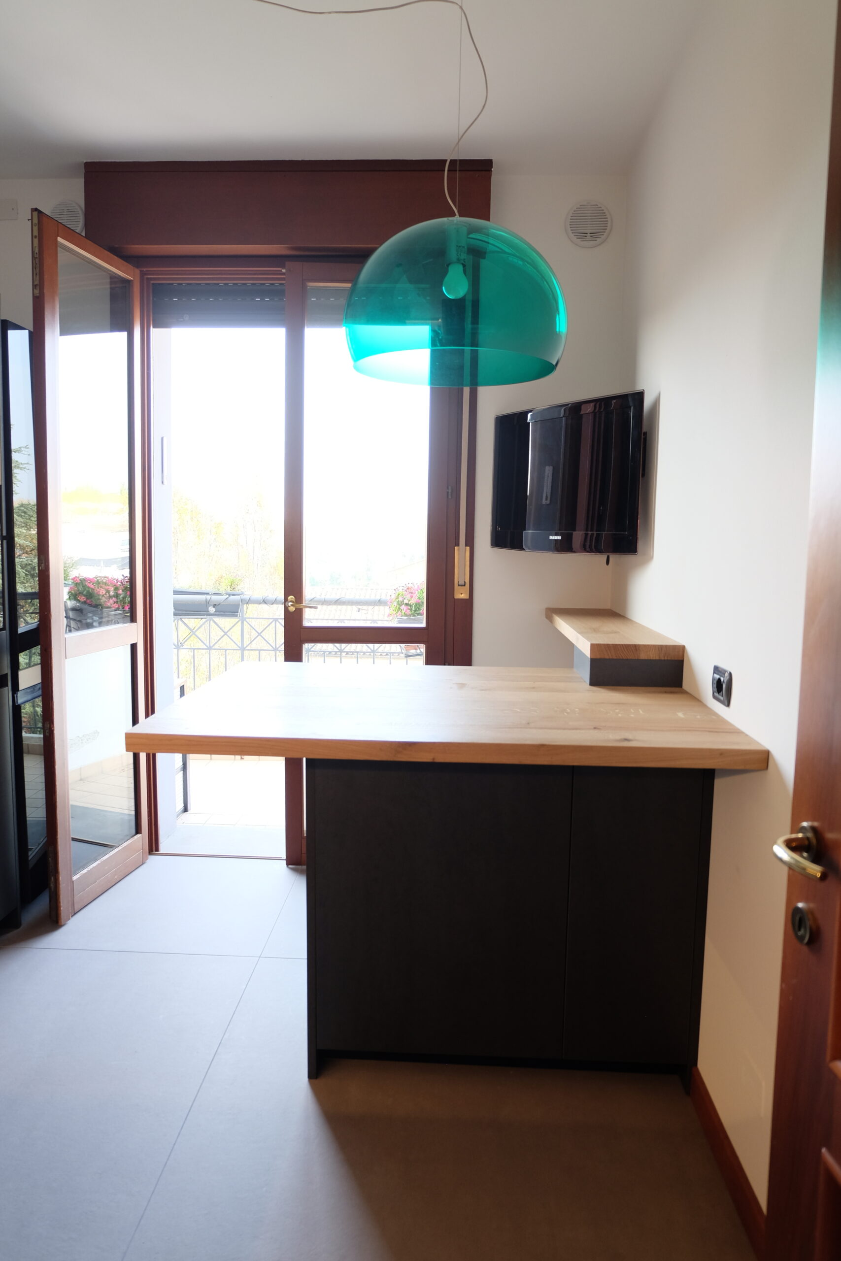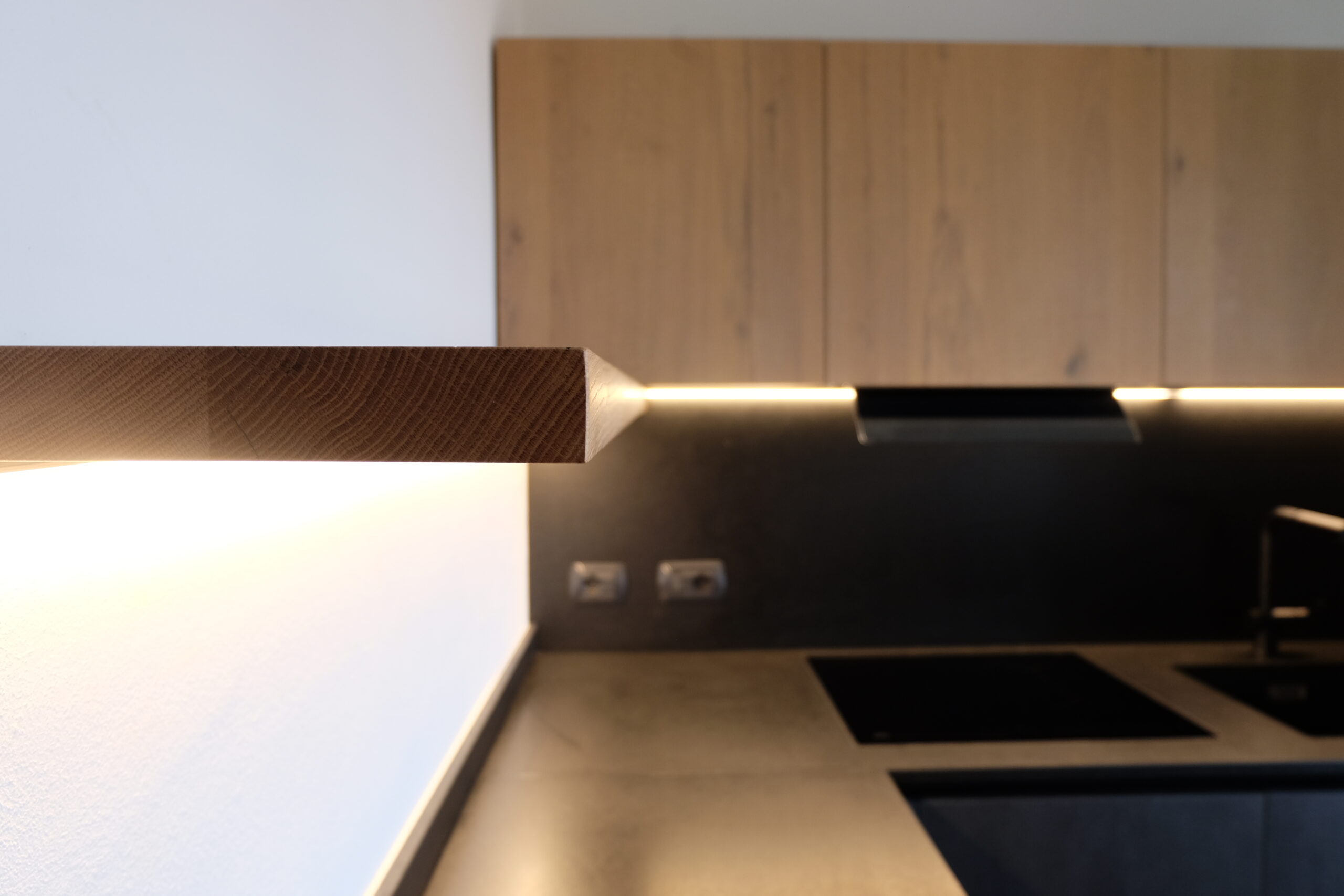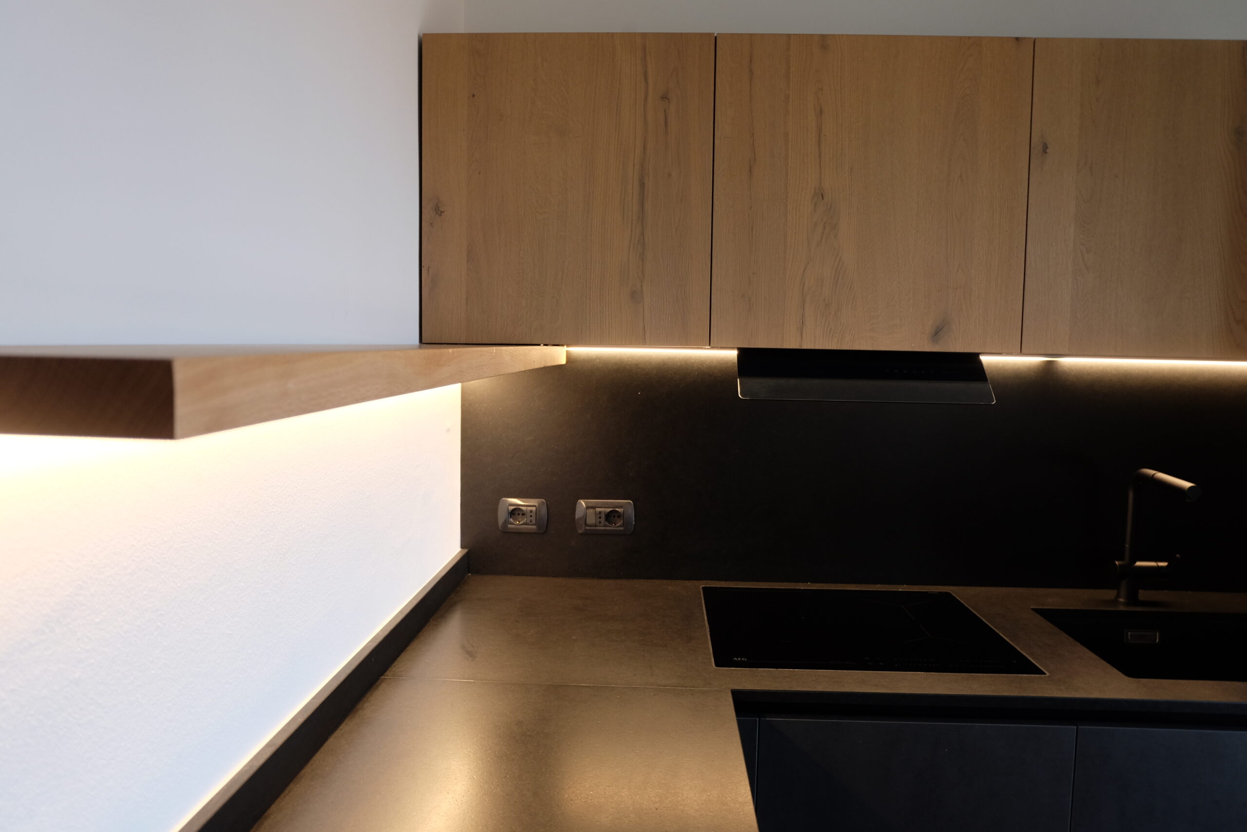 CUCINA NERA CON PIANO IN GRANITO E DETTAGLI IN LEGNO MASSELLO