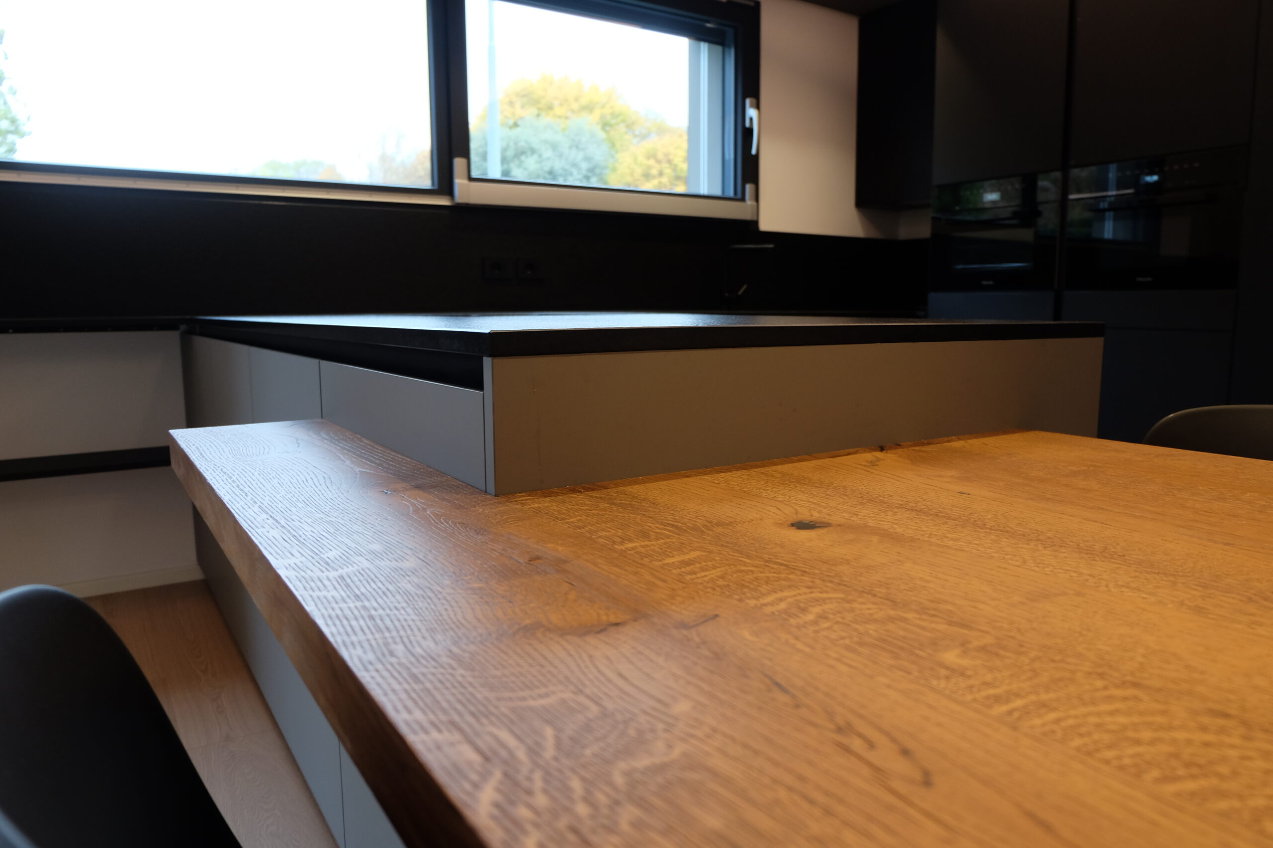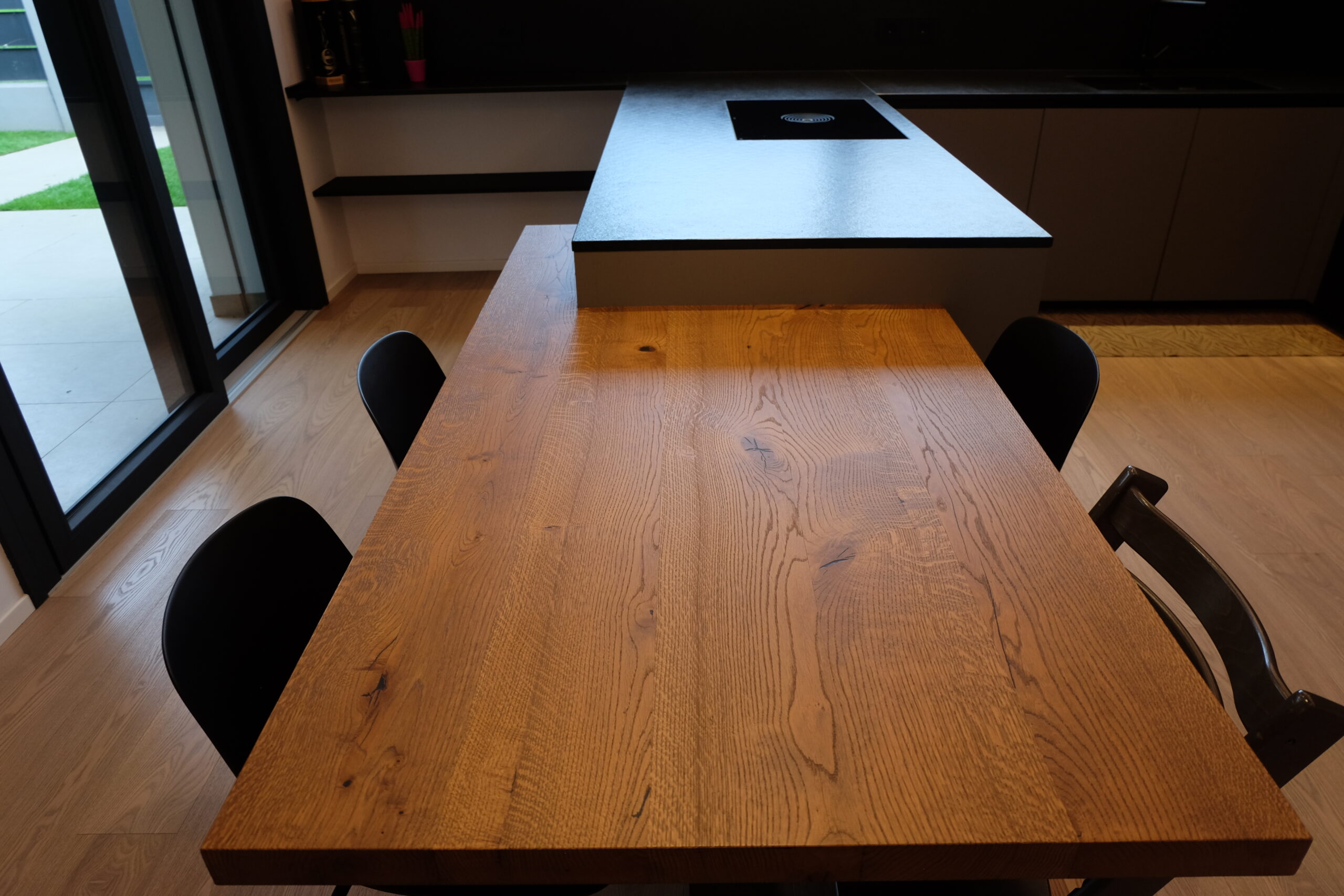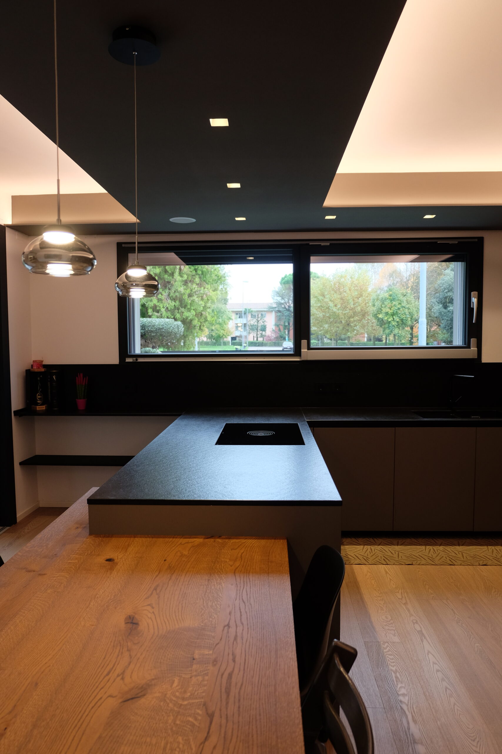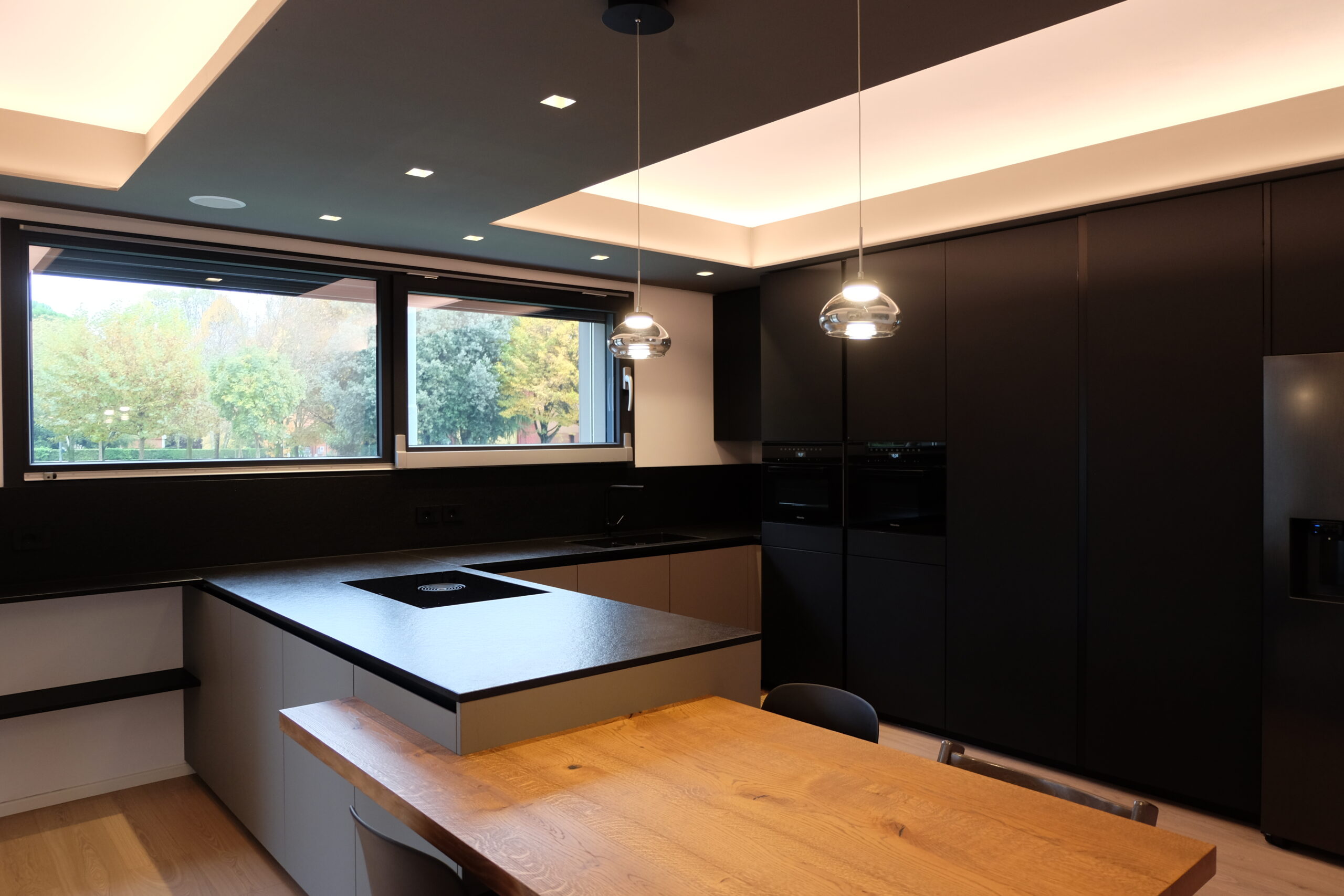 Studio di una cucina con piano di lavoro in granito e piano cottura BORA sulla penisola, completa di tavolo ad incastro in legno massello.