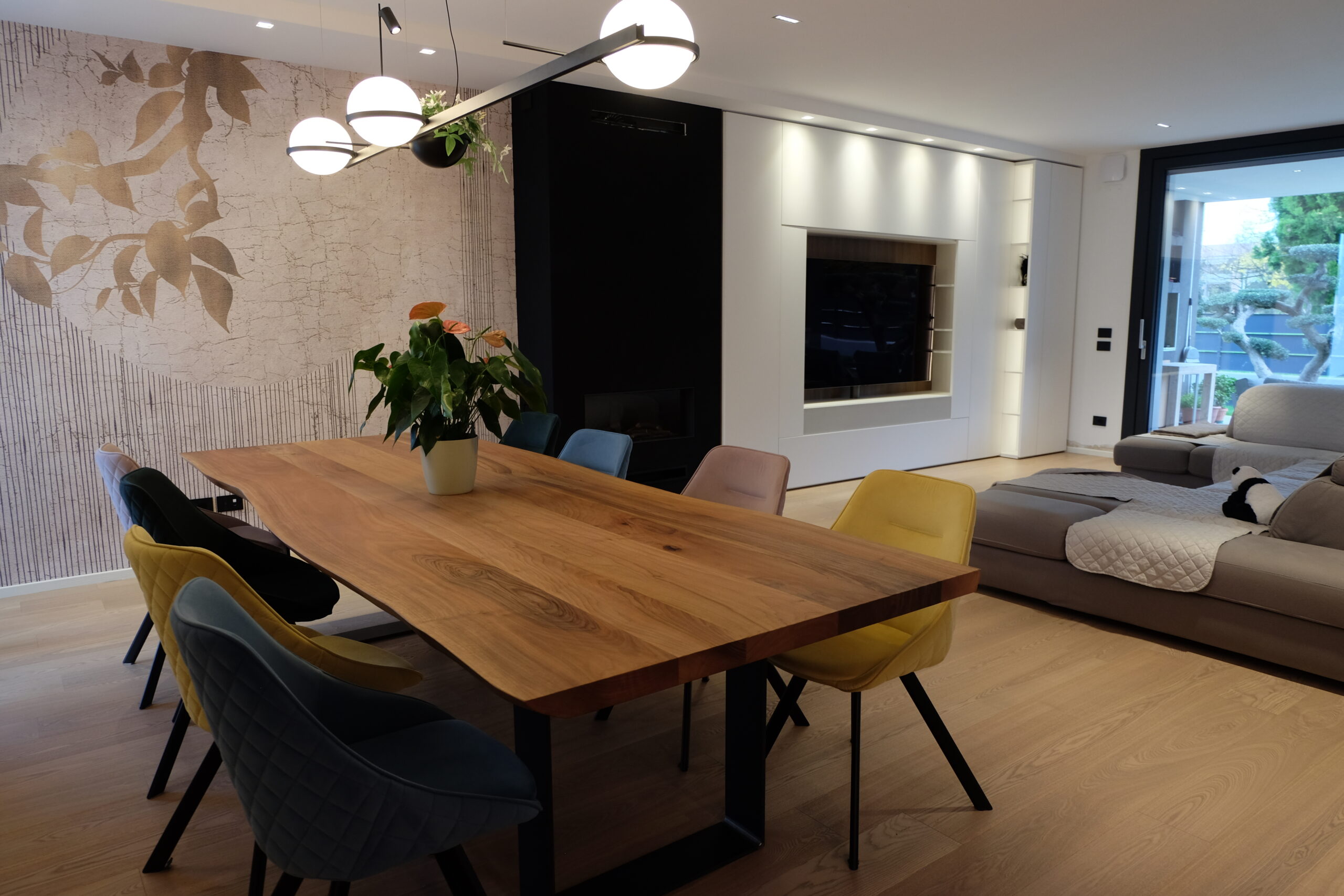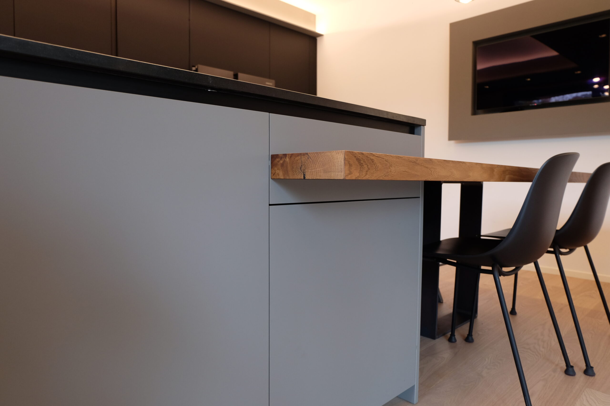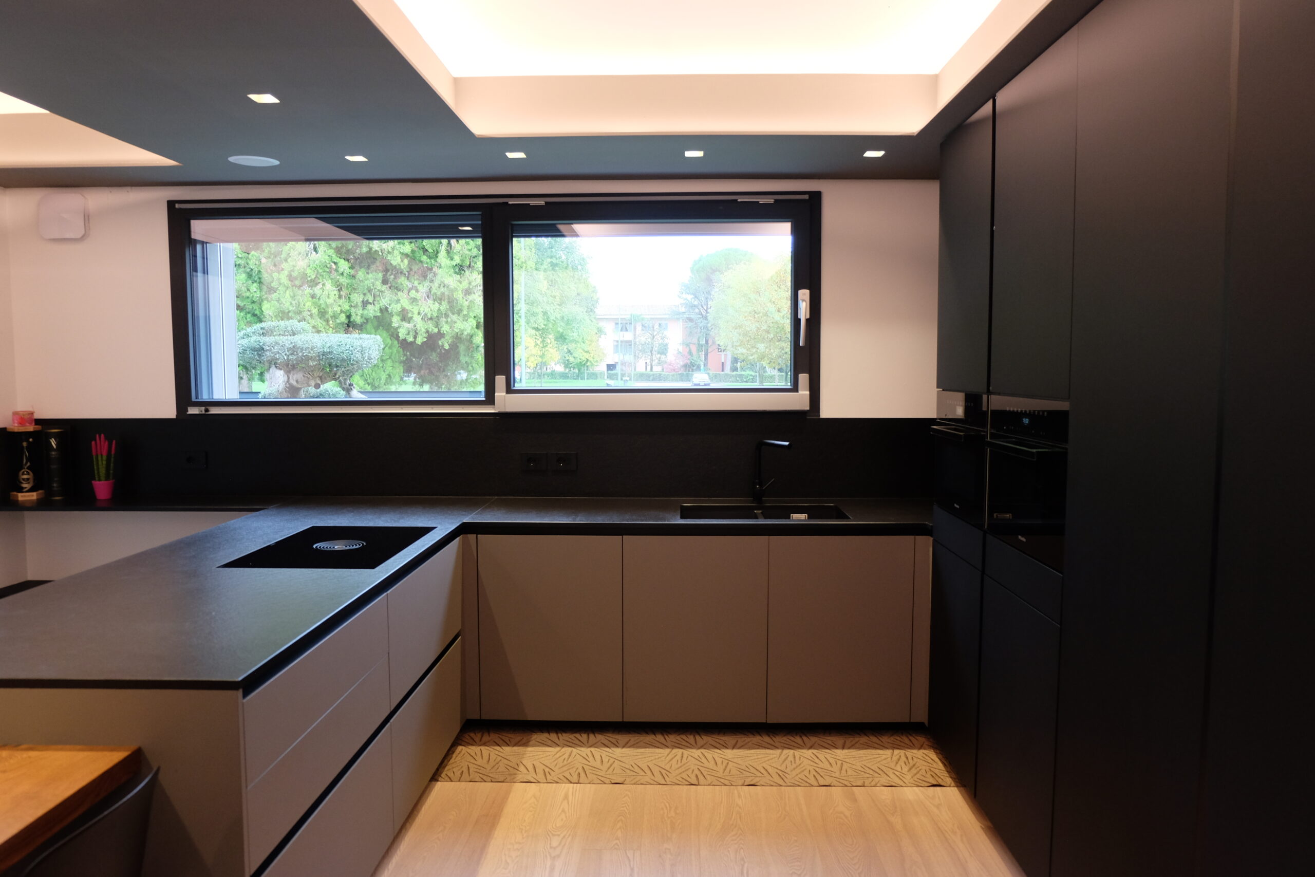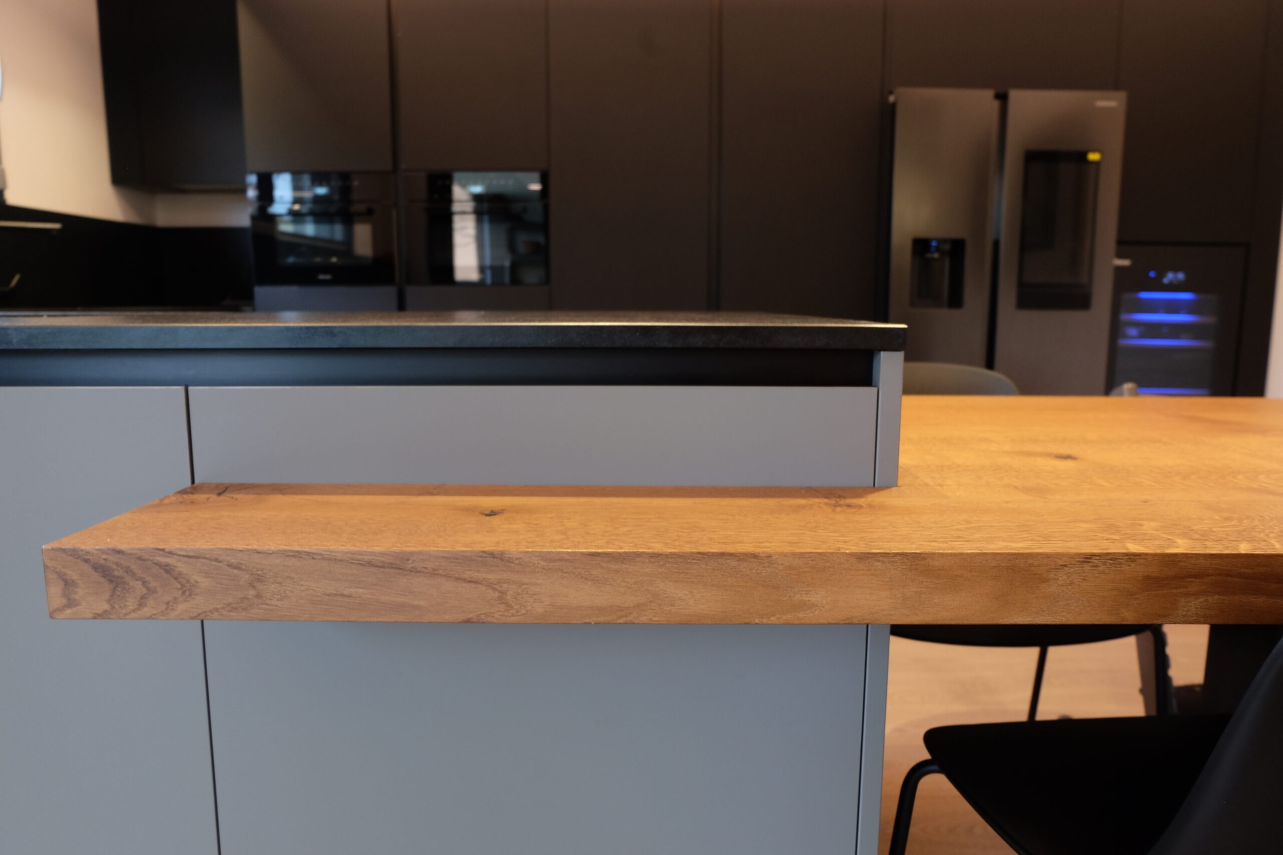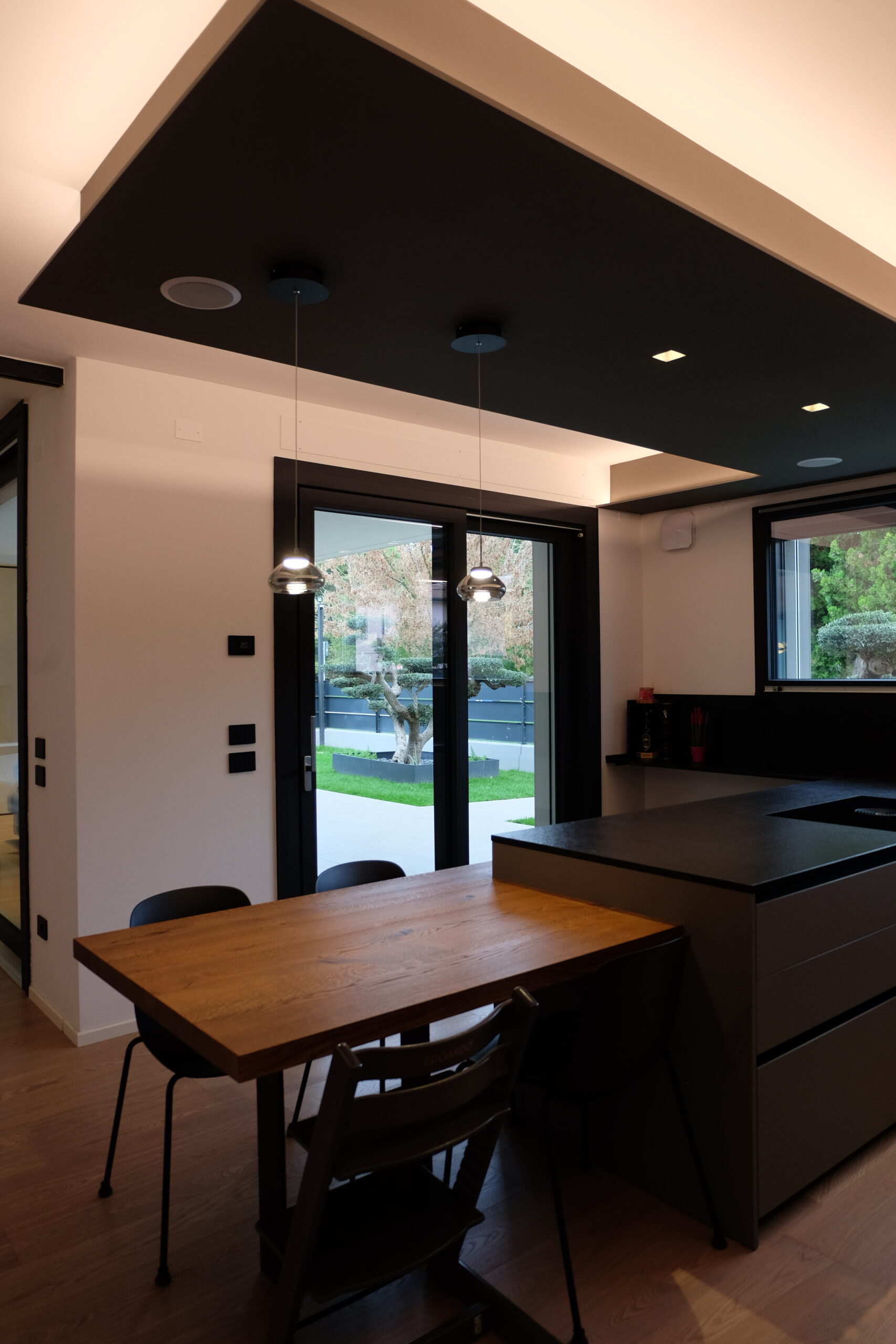 Studio di una cucina con piano di lavoro in granito e piano cottura BORA sulla penisola, completa di tavolo ad incastro in legno massello.
