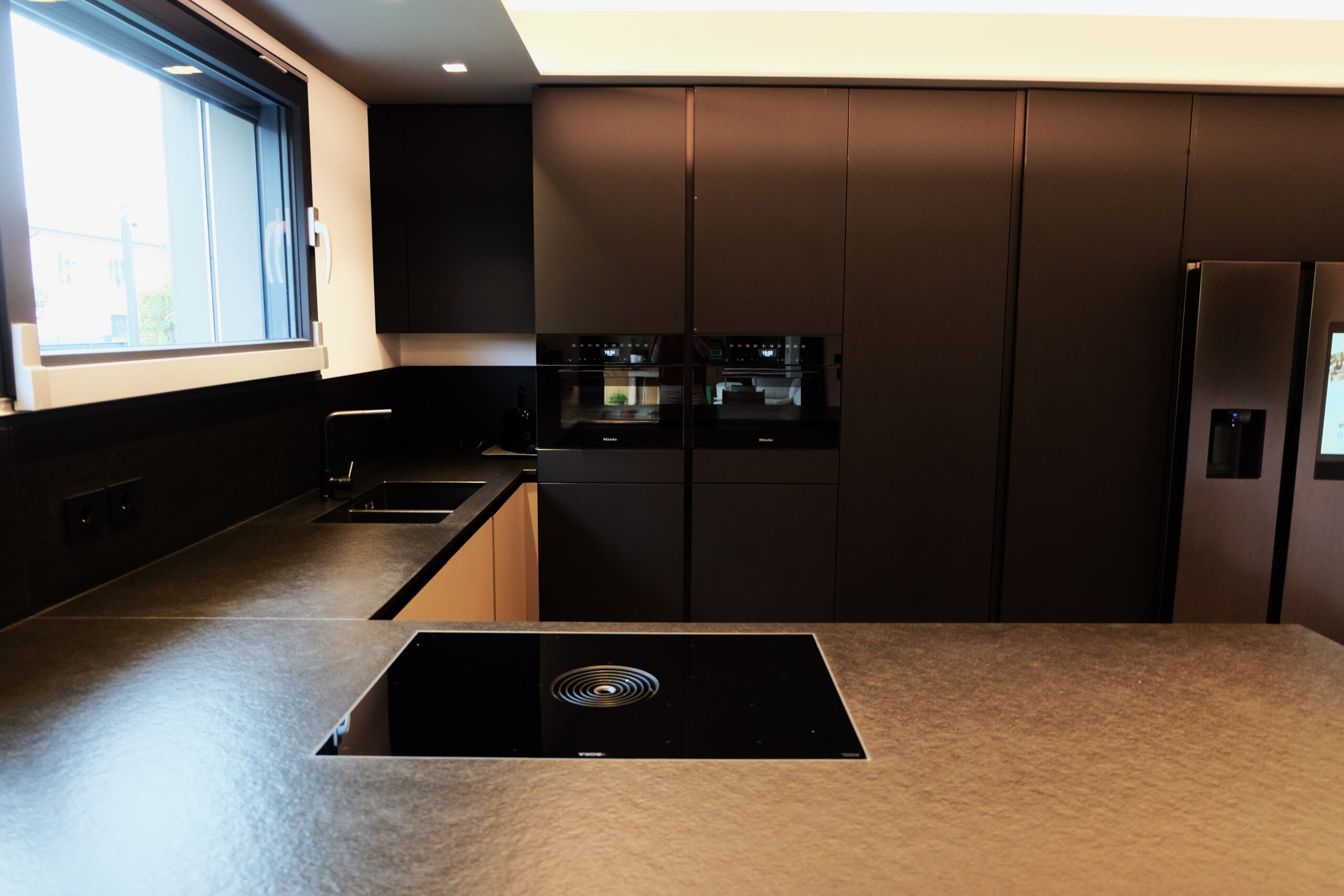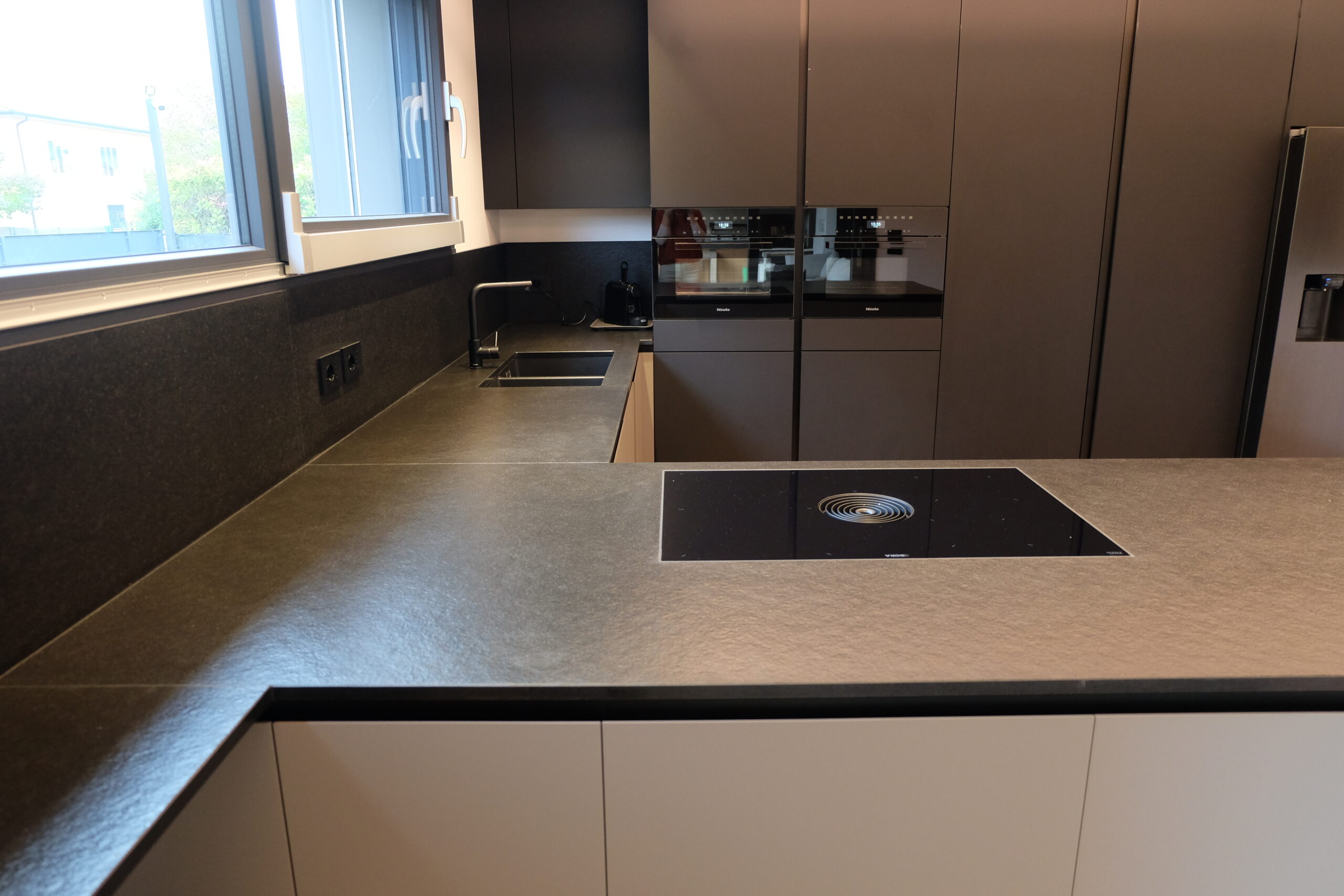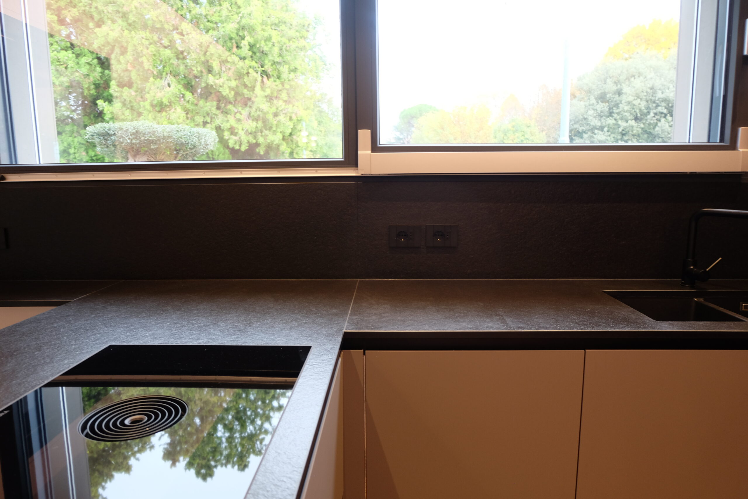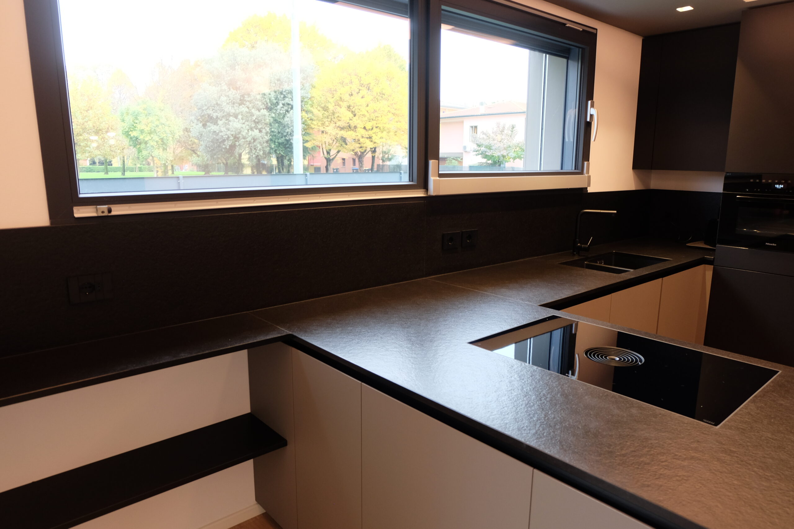 Studio di una cucina con piano di lavoro in granito e piano cottura BORA sulla penisola, completa di tavolo ad incastro in legno massello.