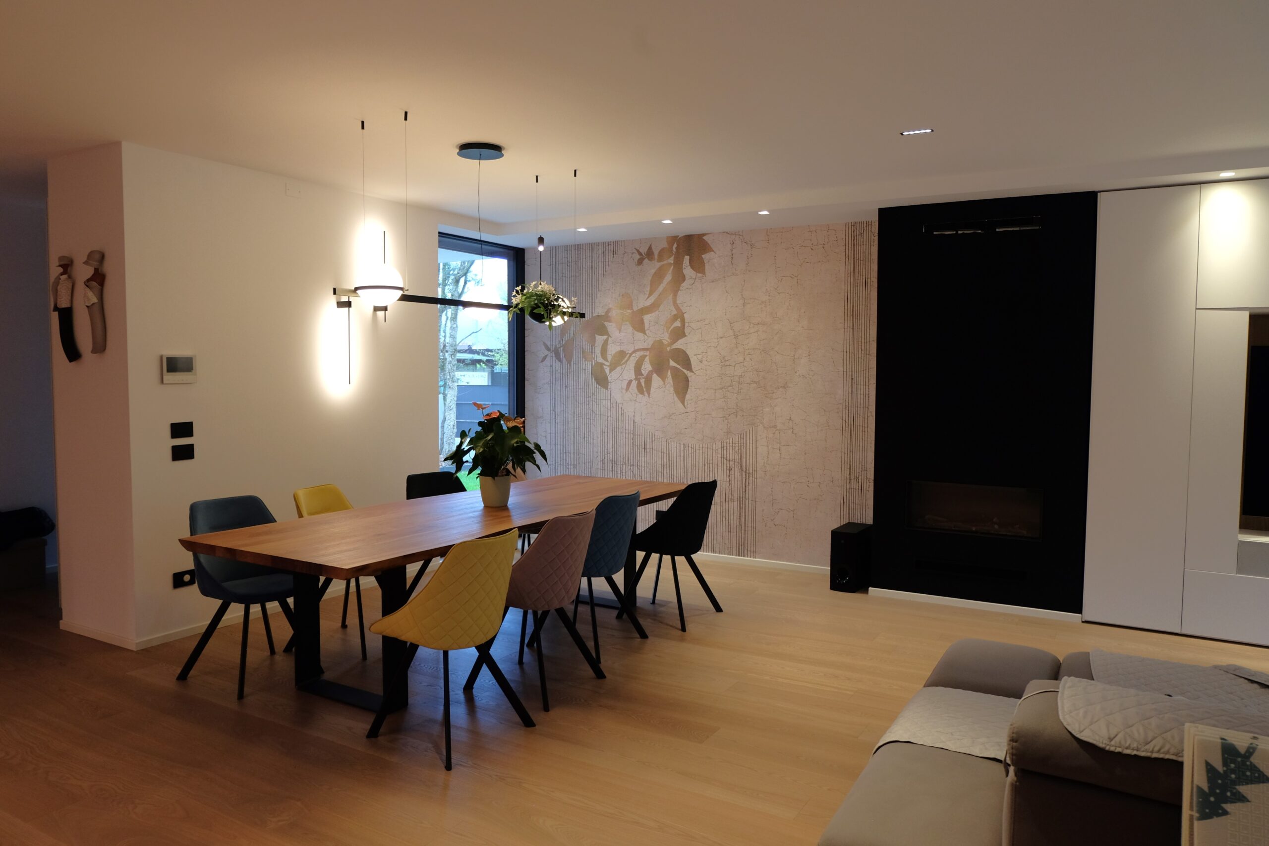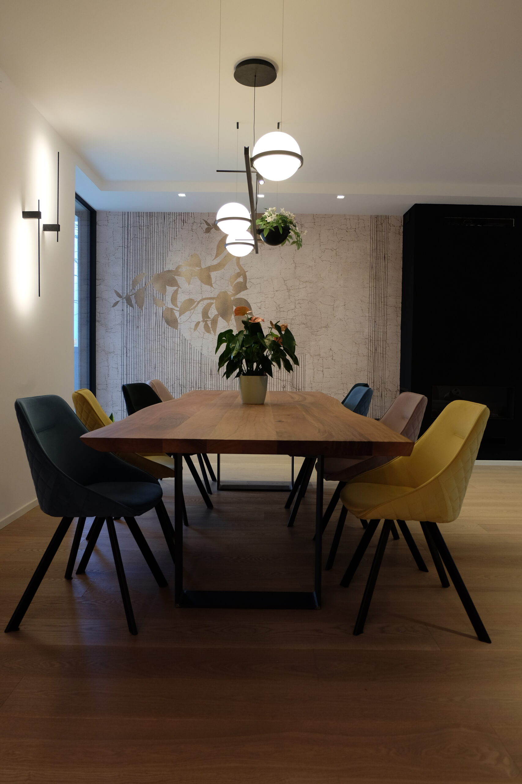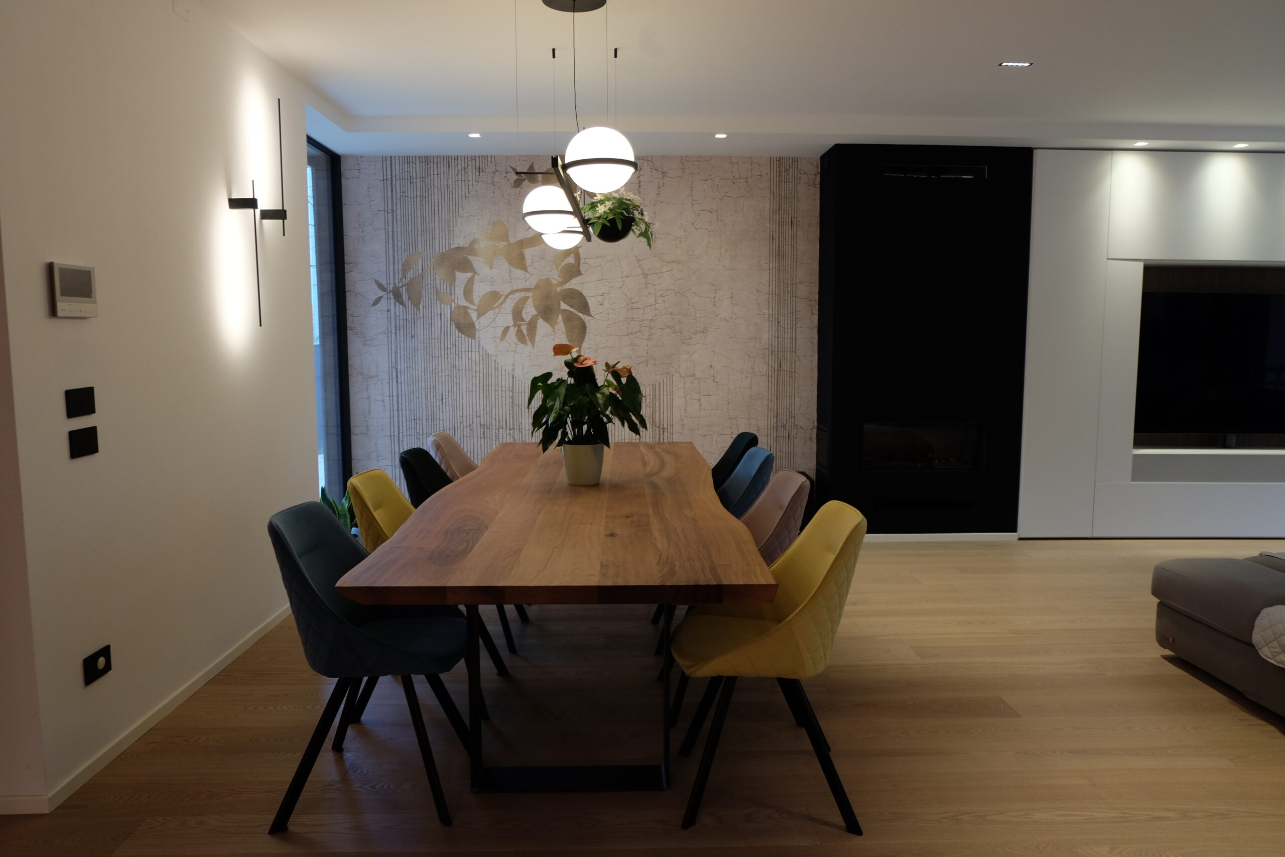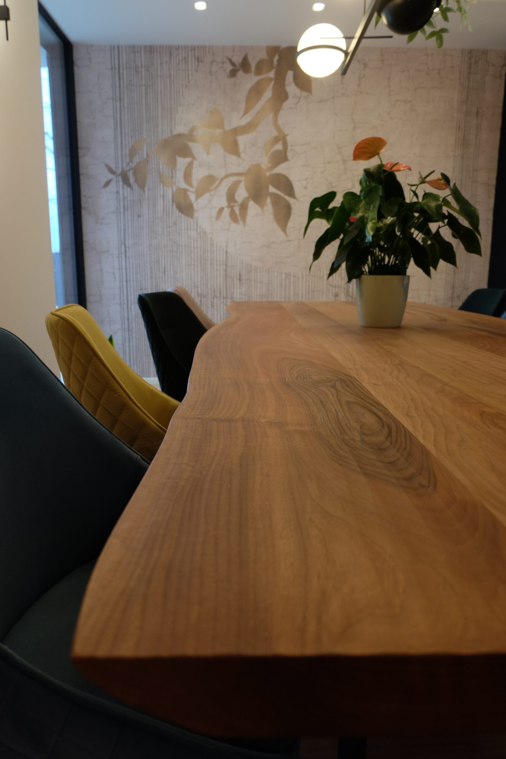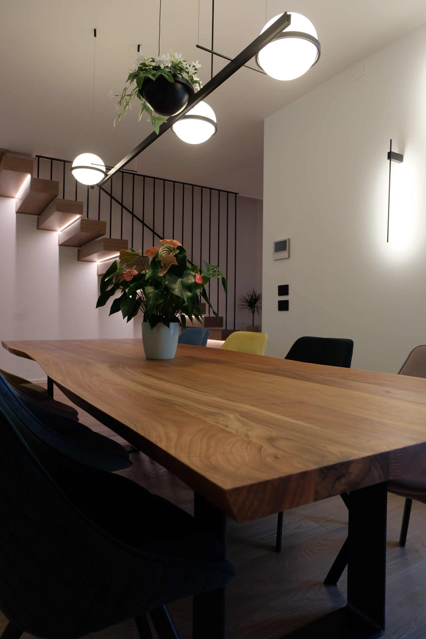 Studio di una cucina con piano di lavoro in granito e piano cottura BORA sulla penisola, completa di tavolo ad incastro in legno massello.