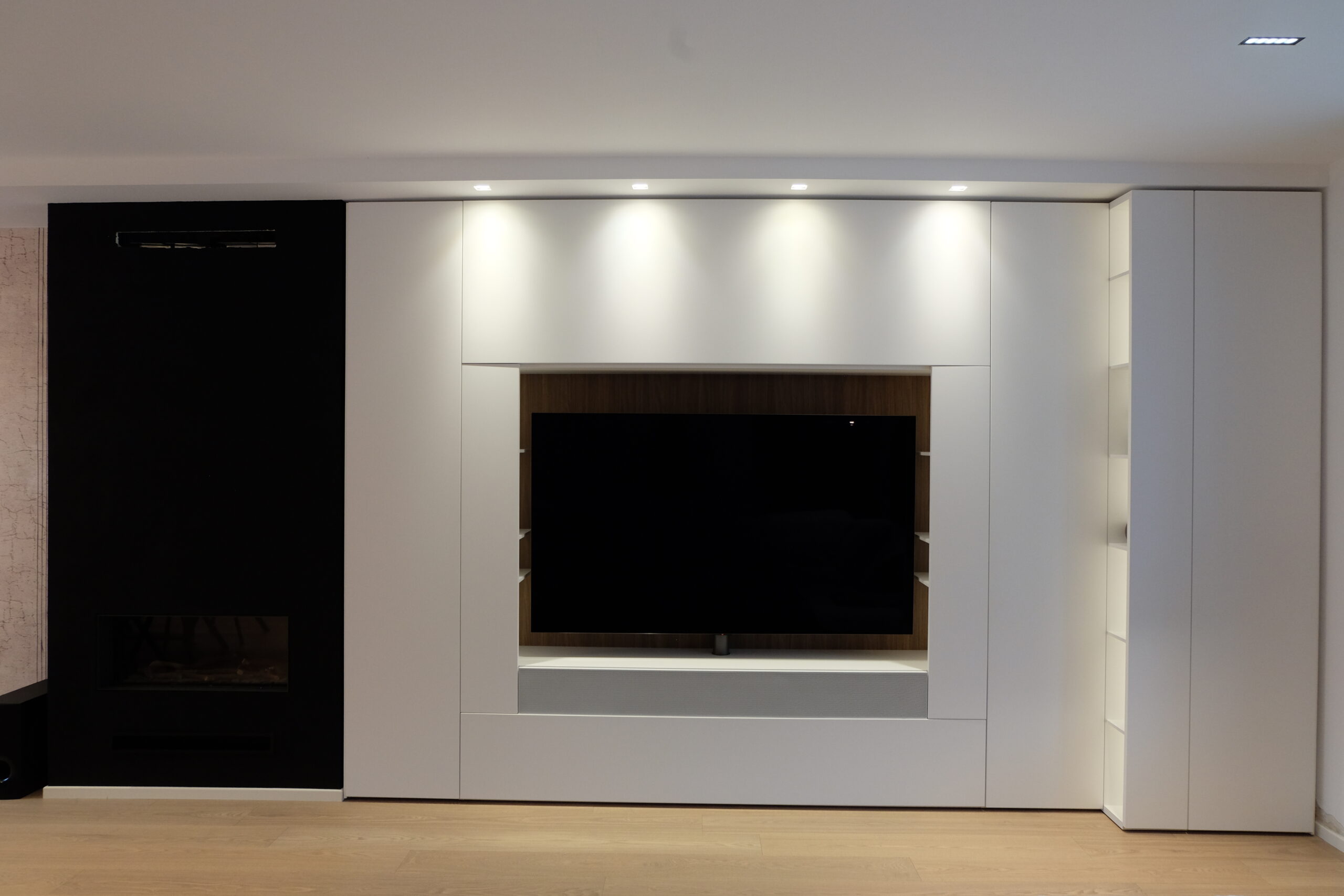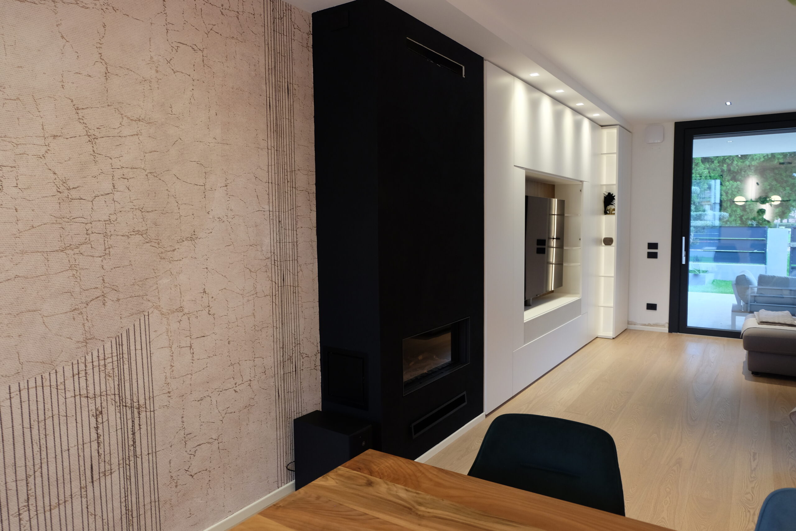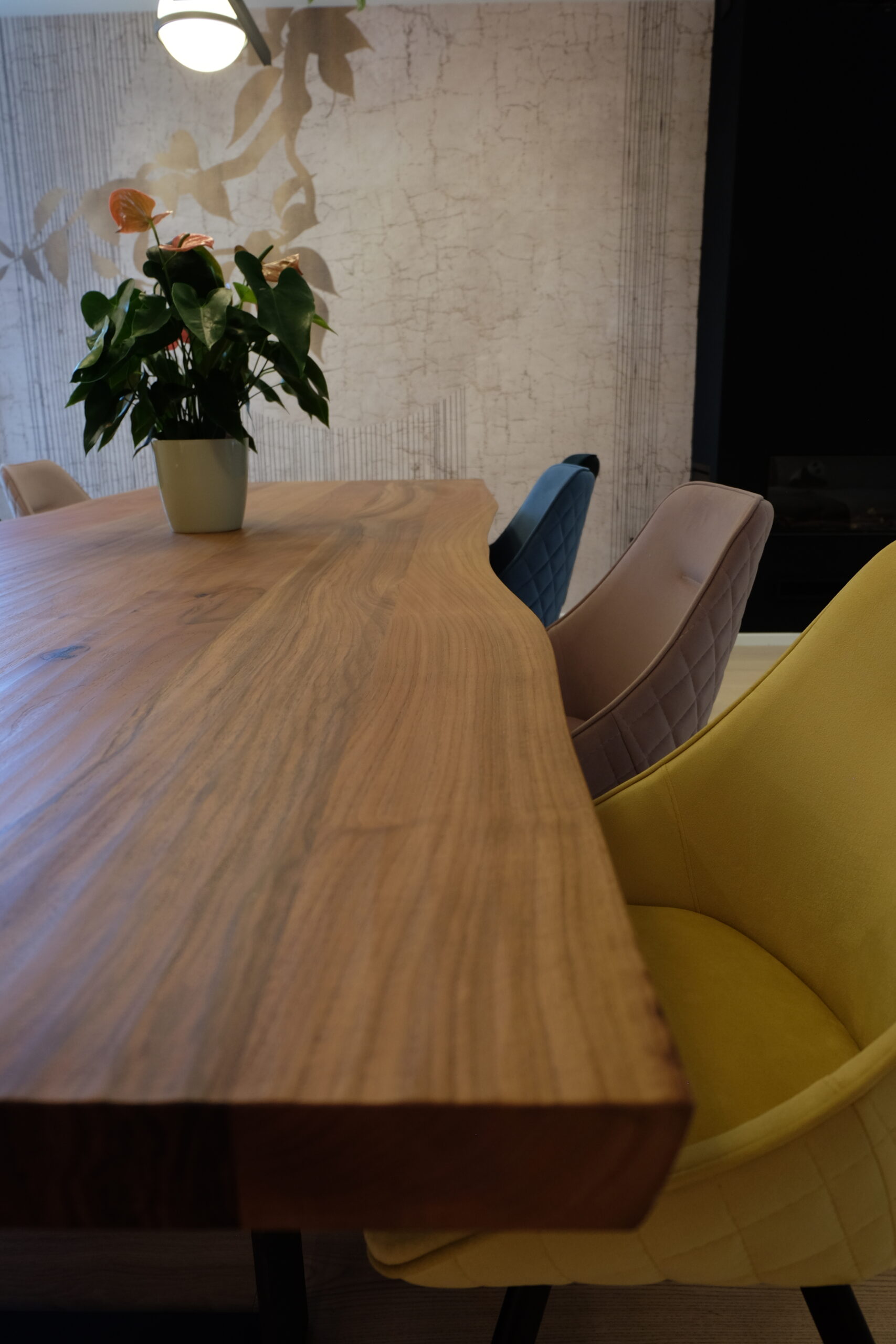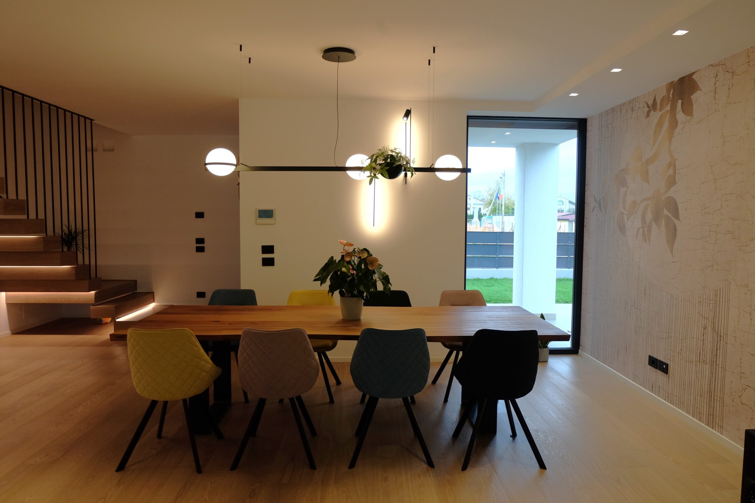 Studio di una cucina con piano di lavoro in granito e piano cottura BORA sulla penisola, completa di tavolo ad incastro in legno massello.