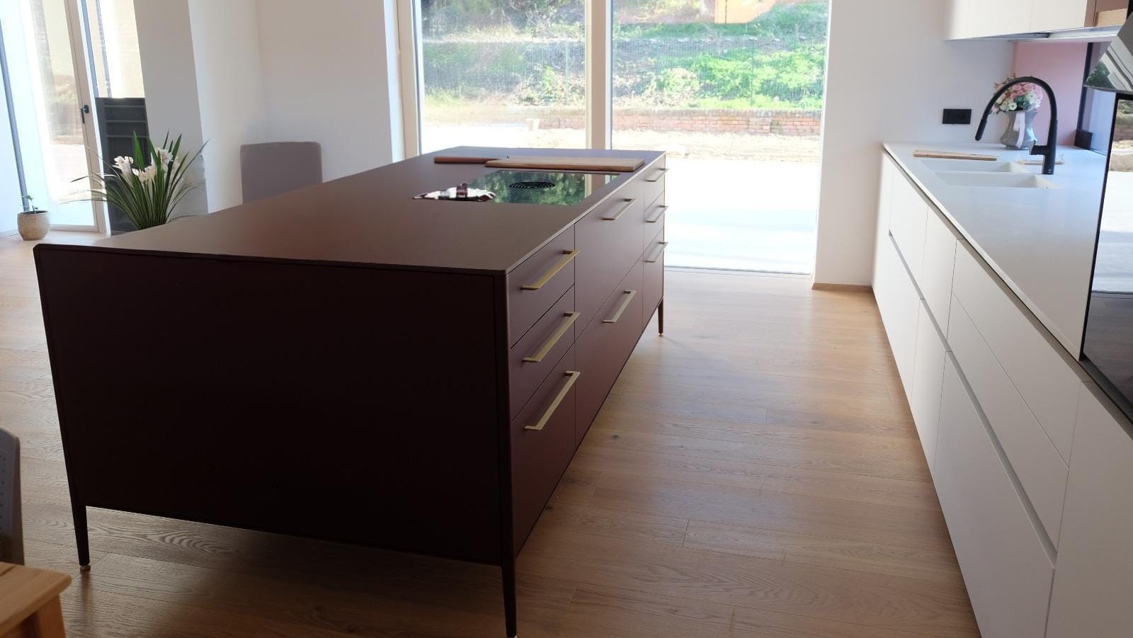 L’isola Unit, iconica per i suoi piedi leggeri che la sollevano da terra, è rifinita in laccato e fenix rosso jaipur, un materiale opaco e morbido al tatto. La tecnologia è ai massimi livelli con il sistema di aspirazione BORA integrato nel piano e il rivoluzionario forno BORA XBO incassato in colonna. Le mensole in massello aggiungono un tocco di calore naturale che bilancia l’anima tecnica della composizione.